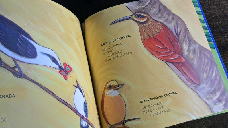 PASSARINHOS DO BRASIL: poemas que voam, de Lalau e Laurabeatriz (Petrópolis, 2013) apresenta-se às nossas mãos como um catálogo ilustrado de espécies que habitam os seis biomas brasileiros – pampas, mata atlântica, pantanal, cerrado, caatinga e floresta amazônica. O nome de cada ave funciona como o título de um texto muito breve, praticamente uma frase simples para as crianças não tropeçarem na linguagem, ao modo de slogans. É Laurabeatriz quem capricha nos detalhes ao retratar as particularidades de pássaros tão belos, quanto exóticos de nossa fauna.