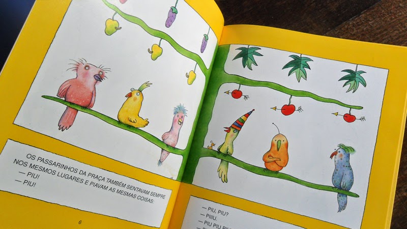 A sátira dá o tom. As personagens de Eva Furnari são cômicas e a ilustração contribui para completar e ampliar o efeito da mensagem – em suas banquetas de assento baixo, pés paralelos, pernas cruzadas, mãos no joelho ou no colo, braços fechados, mãos segurando a cabeça, o pescoço torto, um ouvido espichado, o nariz virado de lado, os olhos procurando alguma coisa, o silêncio, um fio de cabelo fora do lugar etc. Existe, na cena, um equilíbrio incômodo: seis personagens em busca de um assunto, debaixo de uma árvore de galhos simétricos, debaixo de seis passarinhos sentados... O que eles contam? Uma piada?