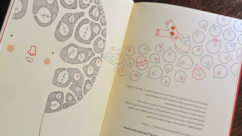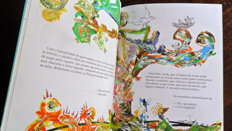 Entre o ridículo e o desânimo, a crítica de Hermes Bernadi Jr. é contrabalanceada por uma ilustração sem figuras definidas, ou definitivas. A árvore voa da tinta para o papel, mostrando-se aos poucos. Hermes lançou mão dos pincéis e do movimento rápido para sugerir uma árvore que página a página vai ganhando seu colorido: sapatos ou flores? O texto de PÉ DE SAPATO (Biruta, 2011) conta-se como uma sugestão de lenda.