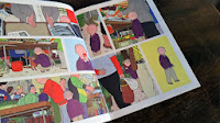 Fazendo a vez de páginas de guarda, a imagem aérea de uma cidade sob as nuvens, indica um ponto de vista livre do narrador e o interesse dele por conduzir o leitor a uma feira a céu aberto, vivamente organizada. Lá, a câmera da ilustração procura o personagem, entre as pessoas, ambulantes, bicicletas, barracas de frutas, verduras, legumes, posicionando-se na altura exata de um menino. Tom é visto de costas, de mãos dadas a um senhor. Ambos caminham devagar e a aproximação é discreta. O menino veste calças claras e jaquetão roxo. Quando vira o rosto, nossos olhos encontram o perfil miúdo e delicado do menino.